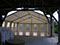 Vue intérieure d'une structure 8m x 20m accolée à une structure 10 x 20 déjà existante sur le site avec parquet vitrifié sur ossature alu et gouttière de jonction entre les 2 structures.